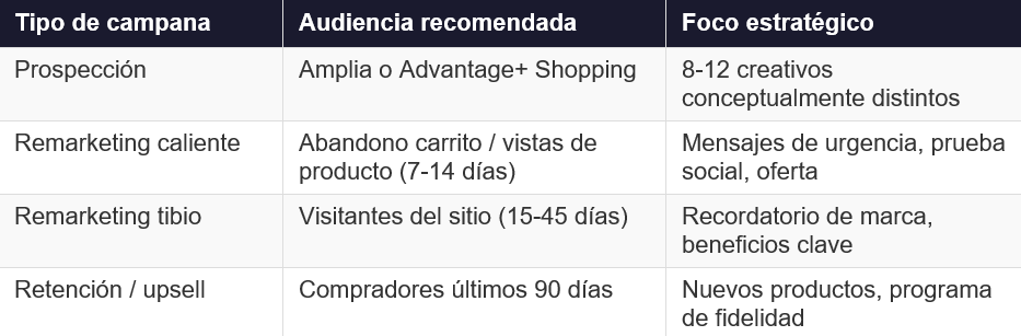 El objetivo de estructura es: 1 campaña de prospección con Advantage+, 1 campaña de remarketing segmentada por temperatura.
