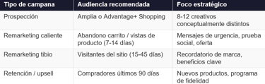 • Usás Advantage+ Shopping o segmentación amplia para la prospeccion, no intereses detallados.