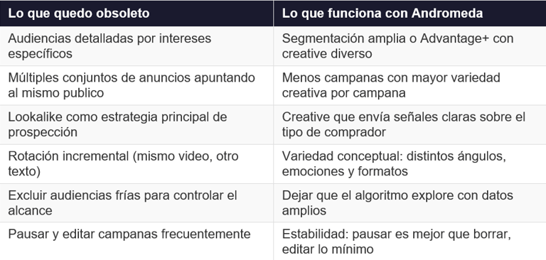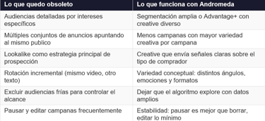 Una advertencia importante: esto no significa que las audiencias personalizadas (Custom Audiences) ya no sirvan. El remarketing de abandono de carrito y compradores anteriores sigue siendo valioso. Lo que cambia es la prospección: ya no tiene sentido construir audiencias frías detalladas cuando Andrómeda puede encontrar compradores potenciales con mayor precisión a partir de las señales del creative.